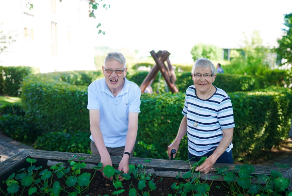 Unsere Bewohner*innen können sich neben dem Aufenthalt in den Gemeinschaftsräumen auch in der anforderungsgerecht gestalteten Außenanlage engagieren. Ein Highlight ist hierbei das Hochbeet, welches von den Bewohner*innen auch selbst bewirtschaftet wird.